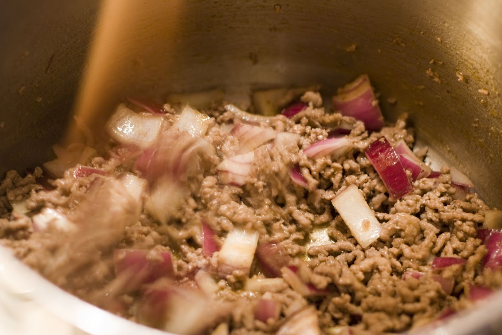 2. Brown your mince (approx 500g) and onion in a little sunflower oil…(don’t forget to add some crushed garlic!)