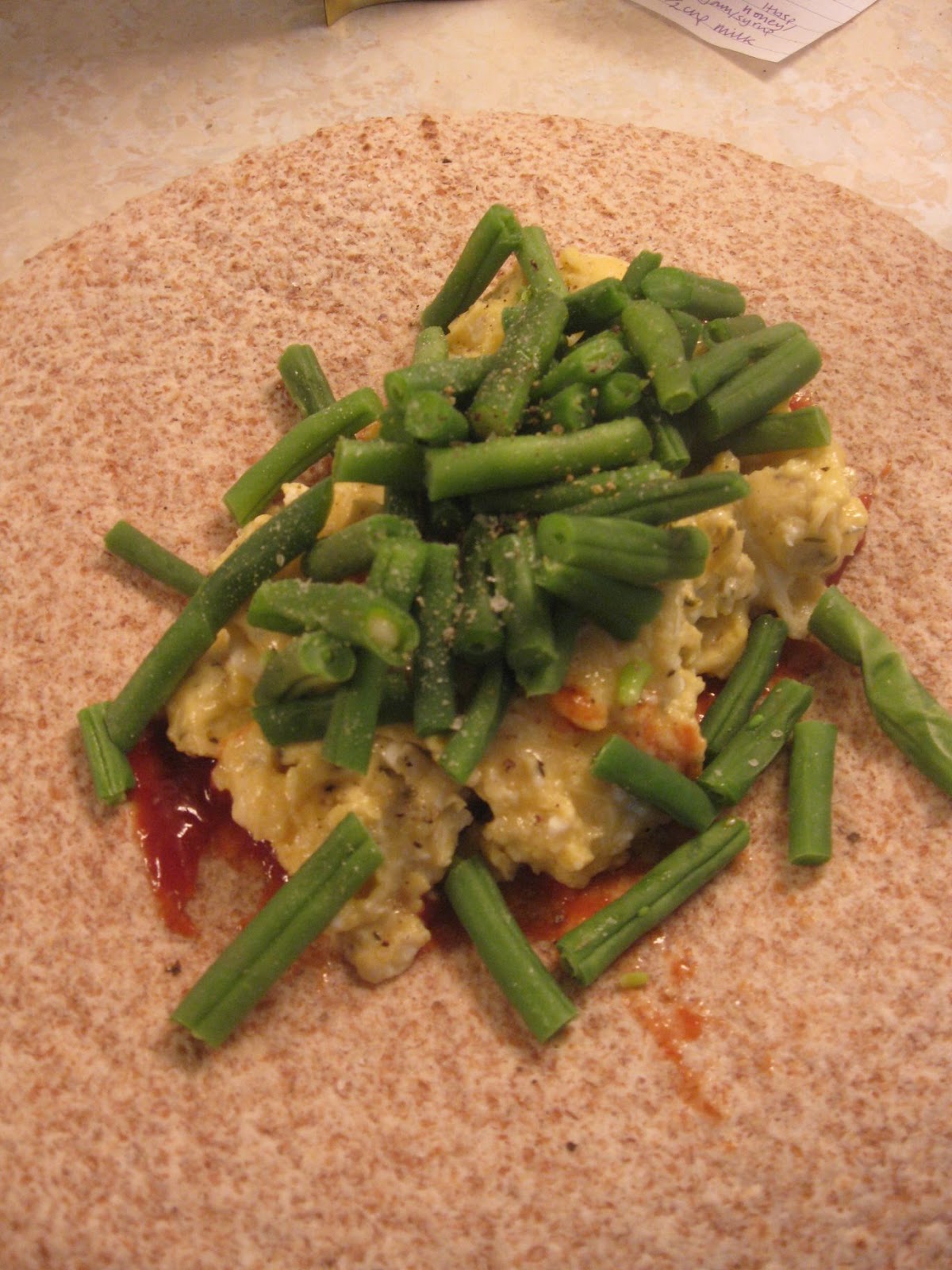 BREAKFAST – Scrambled egg burrito with Stokes ketchup and green beans