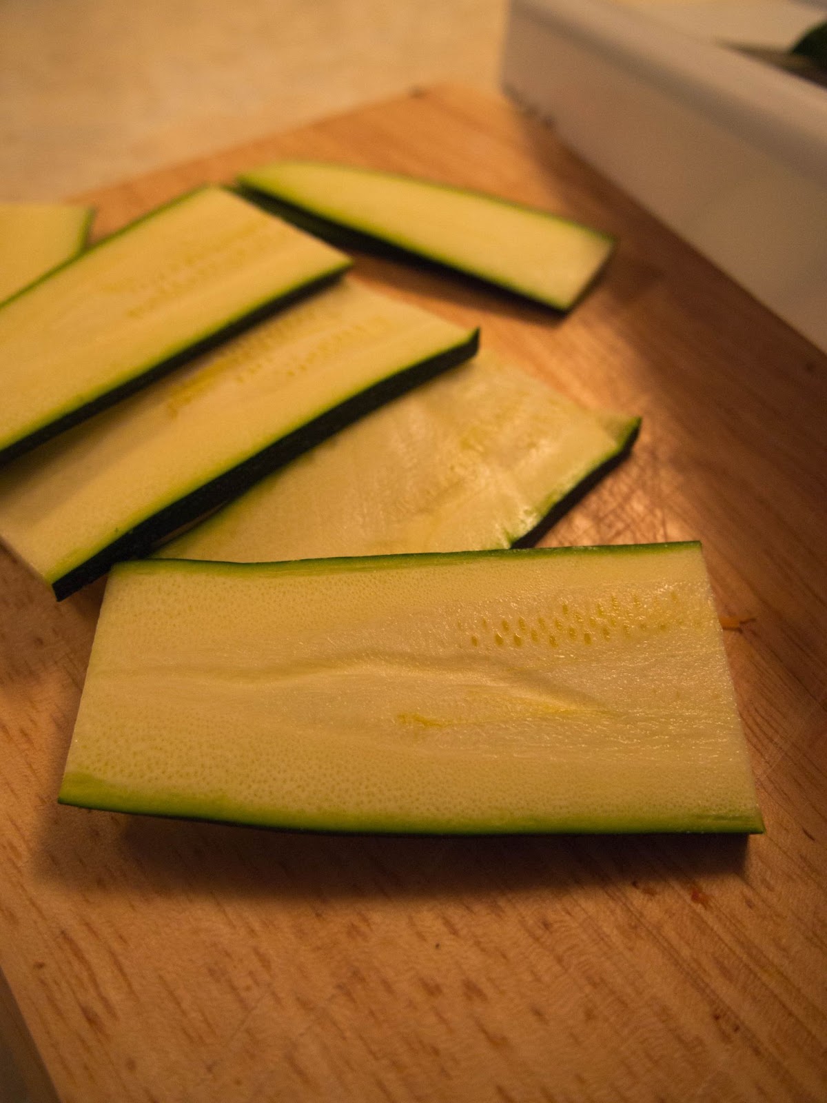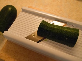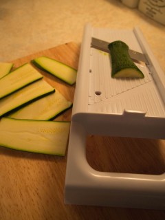 2. Meanwhile cut the courgette in half and slice thinly. I used a mandolin to get (relatively) even slices.
