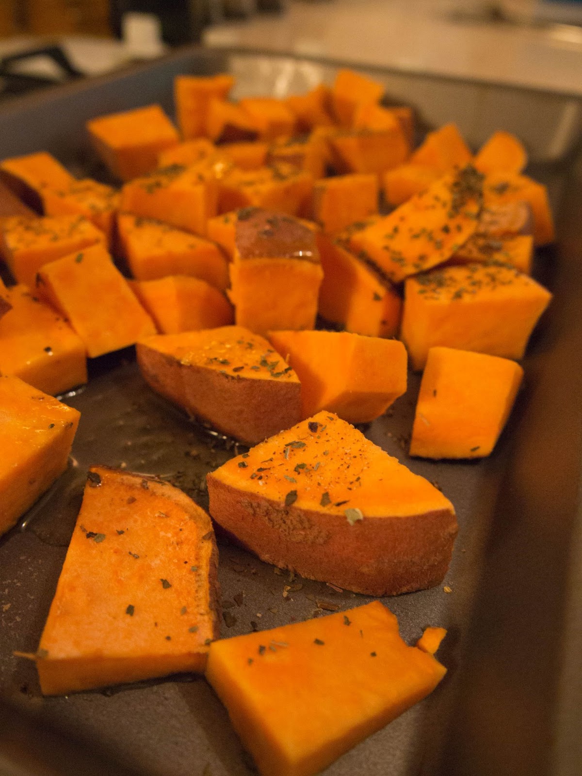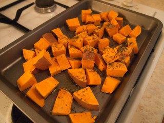 1. Dice the sweet potato (skin on) and put on a baking tray. Drizzle with olive oil and season with herbs and salt and pepper. Mix to ensure thoroughly coated. Then place in a preheated oven (200degreesC) for 20-25minutes, depending on the size of your chunks!
