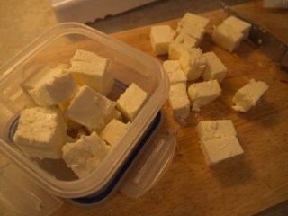 5. Dice your feta into cubes. Since this serves two and it’s just me at the moment, I put half the feta in a tub for the next day!