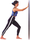 Keep the back leg straight and push the back heel into the ground. Keeping a straight upper body and gently lifting up your hips helps. There shouldn’t be much pressure on the front foot.