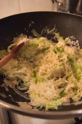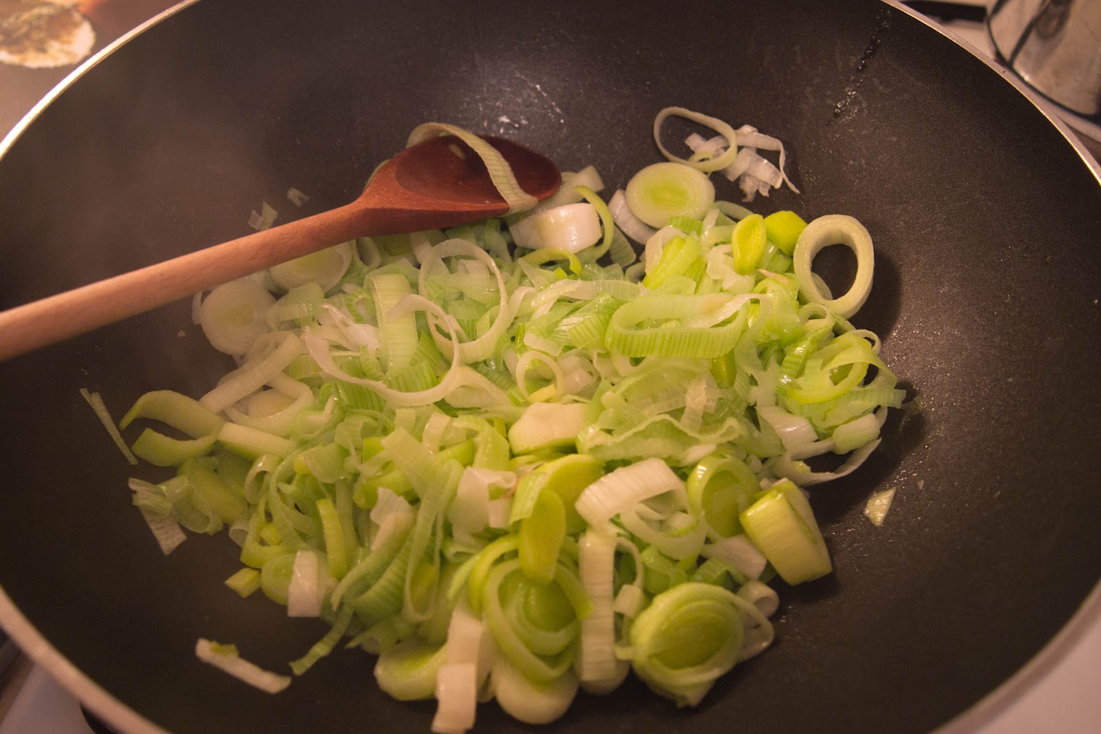 2. Then cut your leeks into slices and cook in some butter until soft.