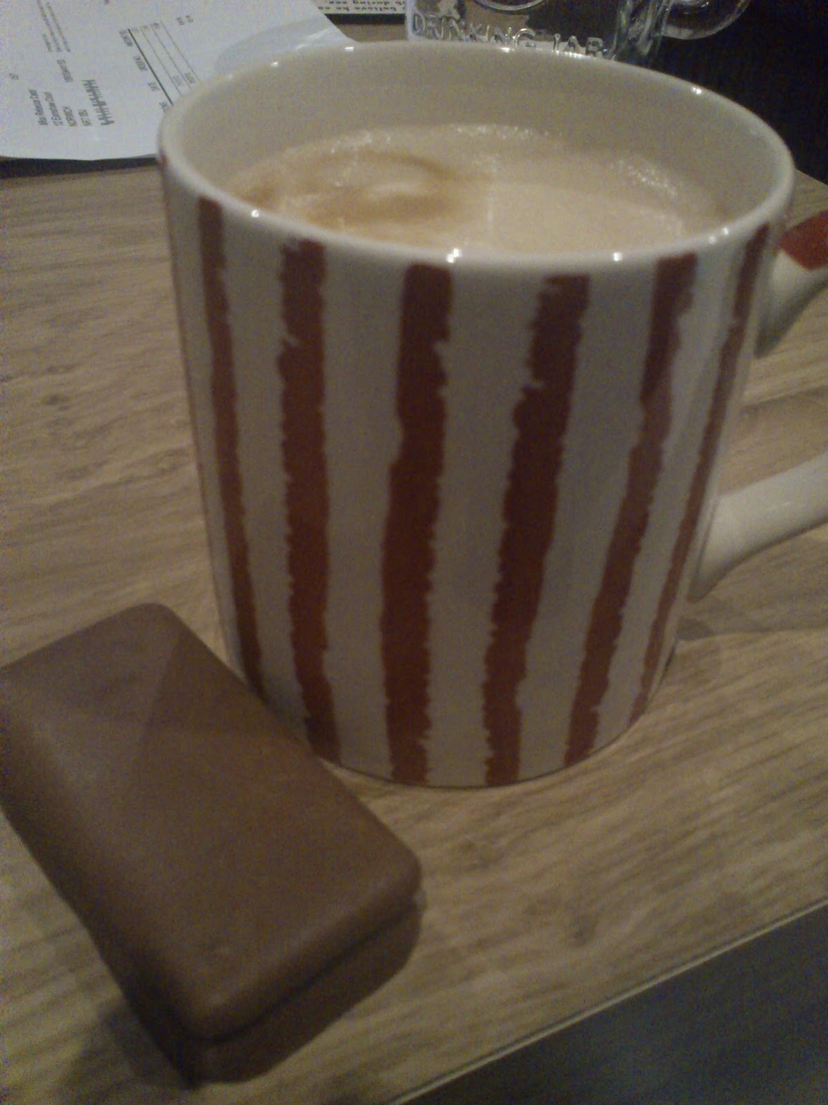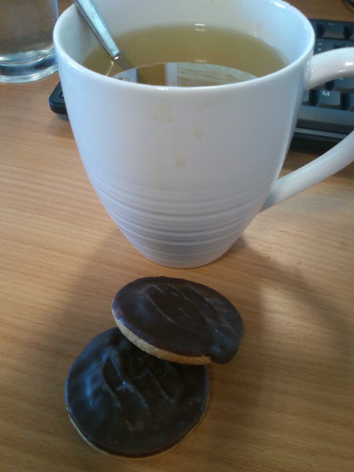 Two jaffa cakes from the office kitchen (someone’s birthday today so they brought sweets in- it always seems to be some occasion here so I have to be choosy!) and a green tea.
