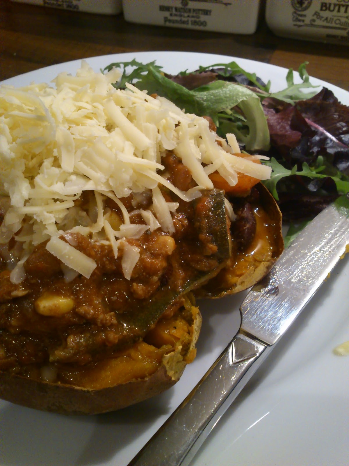 For dinner Mark and I whipped up jacket sweet potatoes topped with leftover chilli (from the freezer) and cheese, with a side salad.