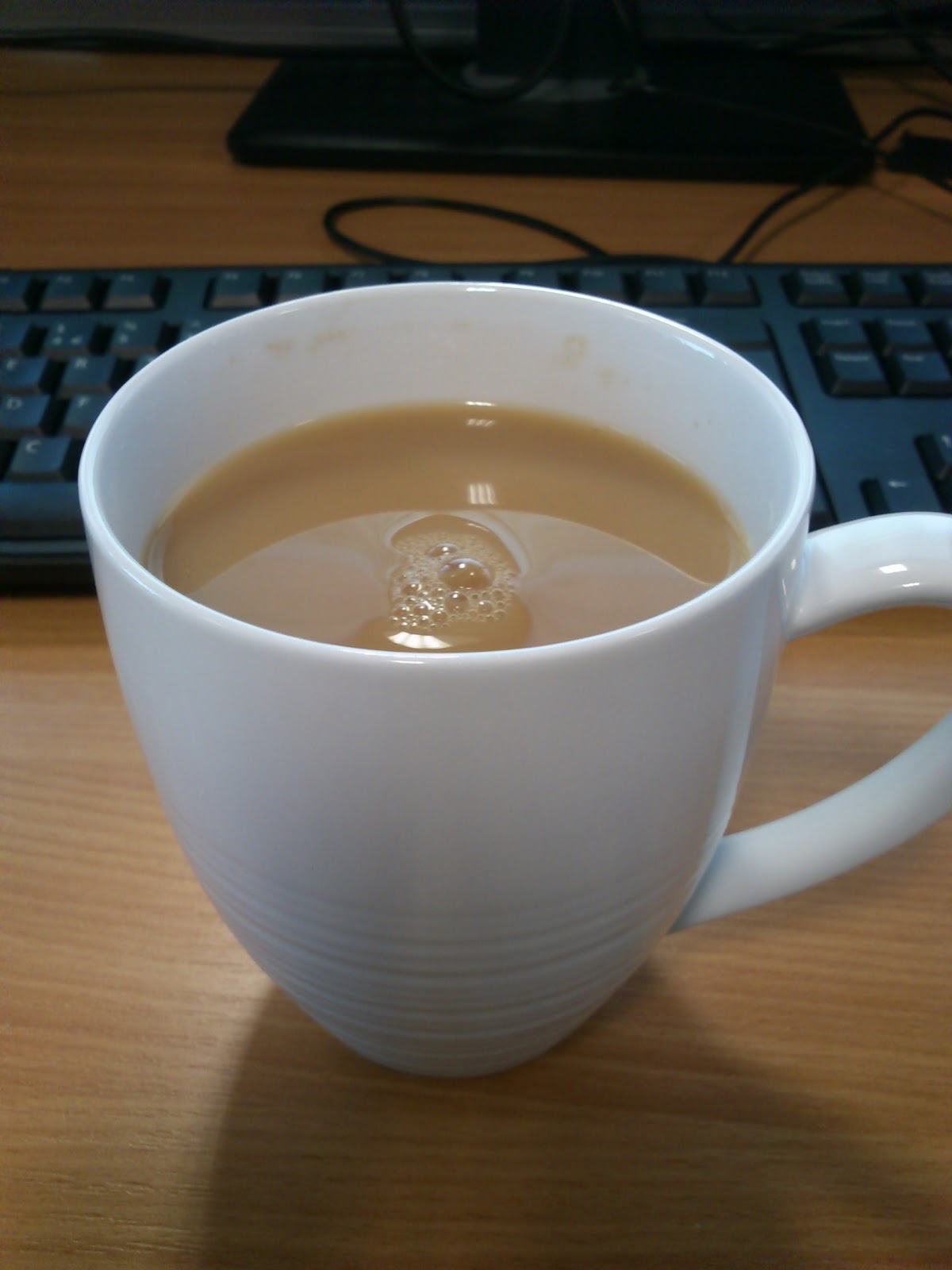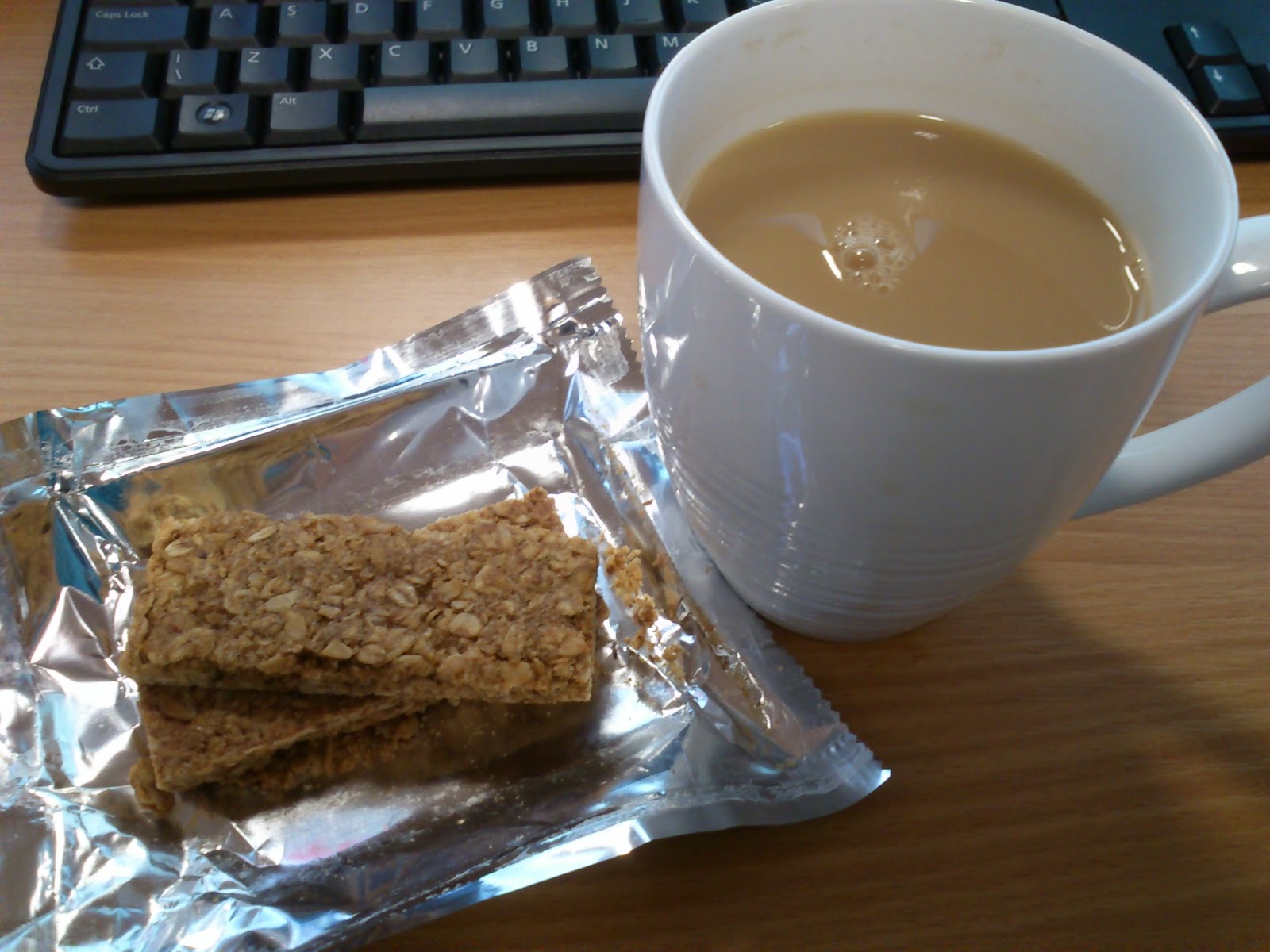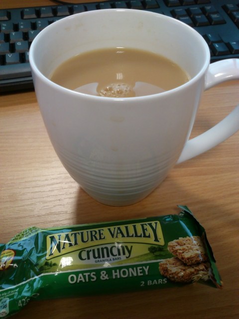 AfternoonAnother cup of tea, and a Nature Valley Oats & Honey cereal bar. I had a pear I was going to eat, but it wasn’t ripe yet- still rock solid!