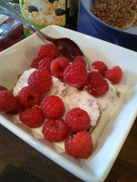 Two weetabix, Activia pouring yoghurt and raspberries! The Activia yoghurt is very convenient, but not really that different to yoghurt in a normal pot- perhaps a bit thinner so it pours easier.