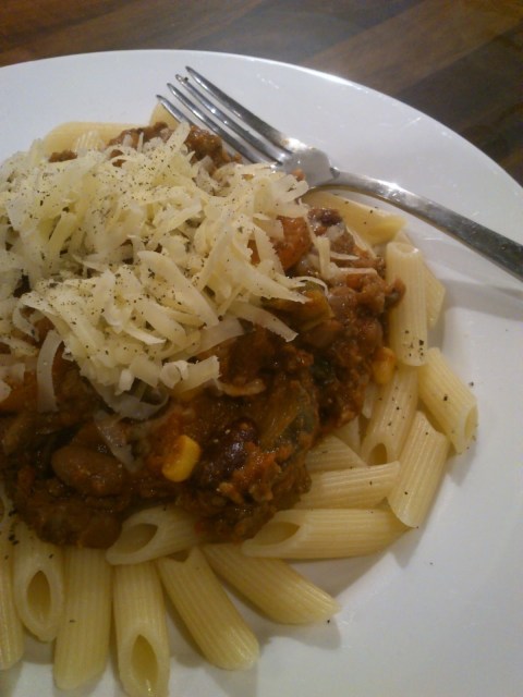 Leftover chilli and wholewheat pasta, with grated smoked cheddar.