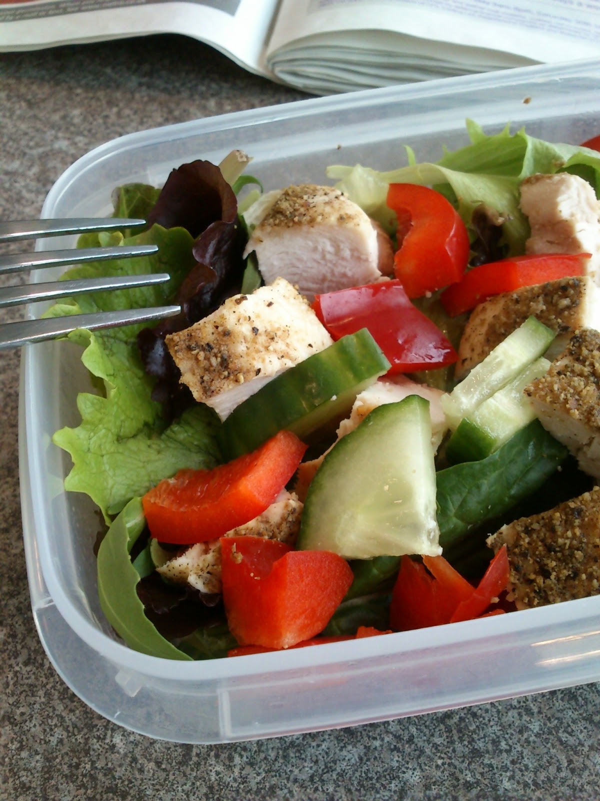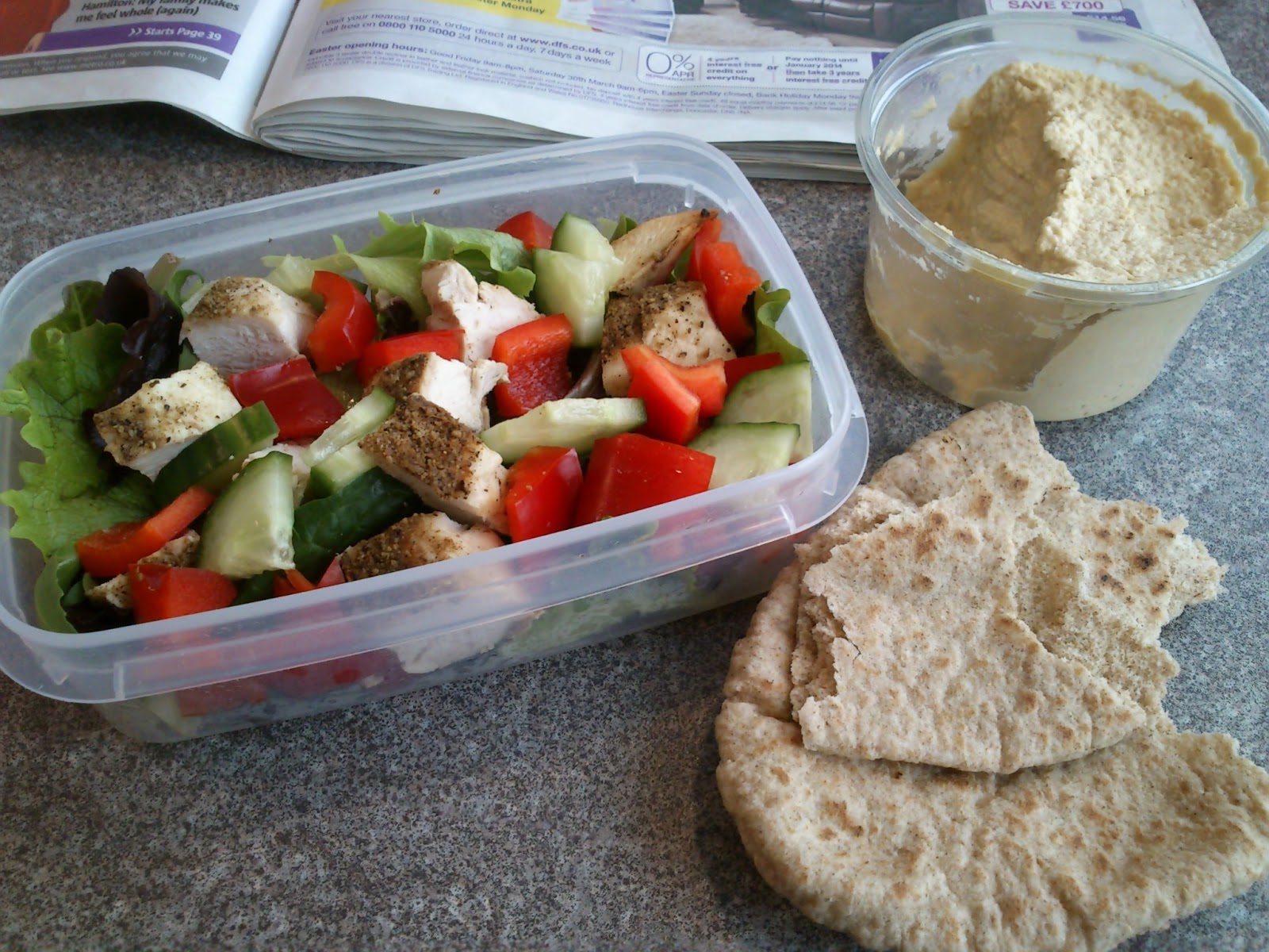 Lunch was chicken salad with pitta bread and houmous- I cooked two chicken breasts in the oven last night with cumin, coriander and pepper; it made a really tasty salad!