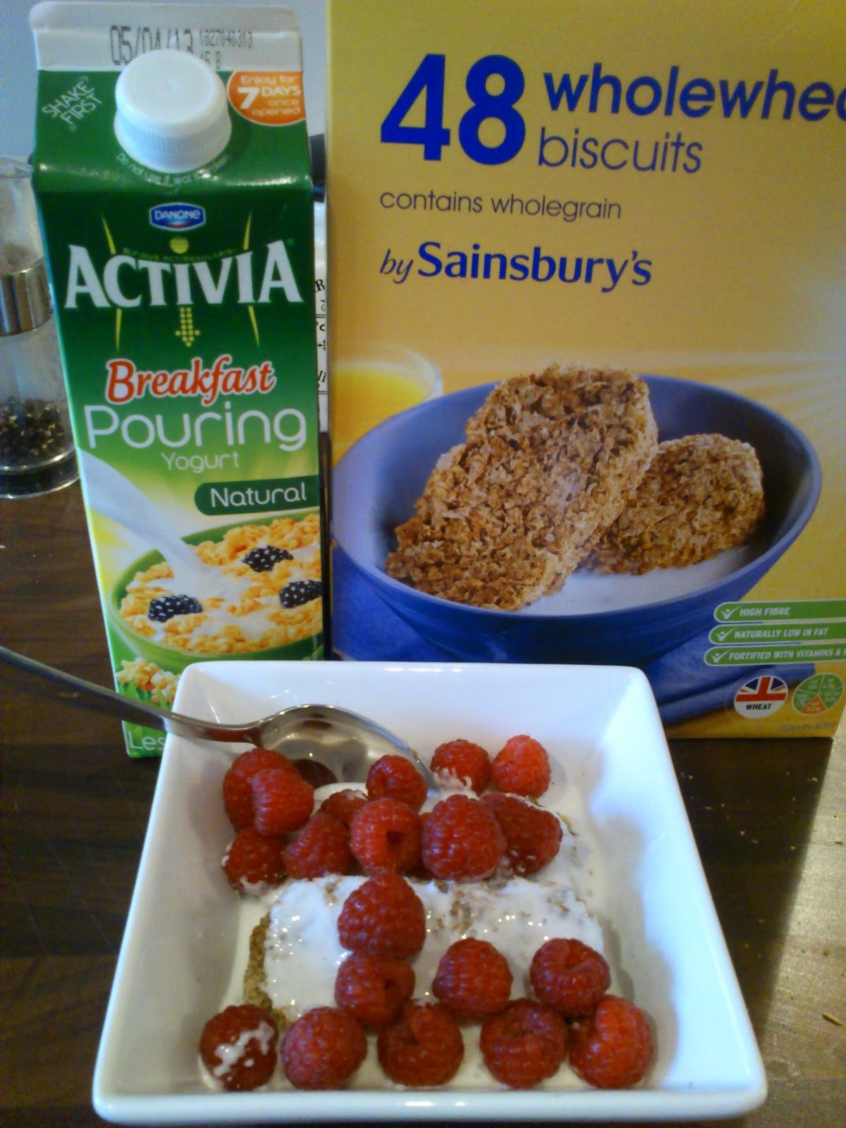 Two weetabix, Activia pouring yoghurt and raspberries! The Activia yoghurt is very convenient, but not really that different to yoghurt in a normal pot- perhaps a bit thinner so it pours easier.