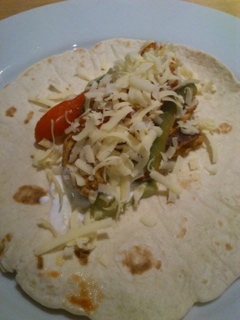 2 chicken breasts, green pepper, red pepper and an onion with paprika and cumin, cooked on the griddle pan.