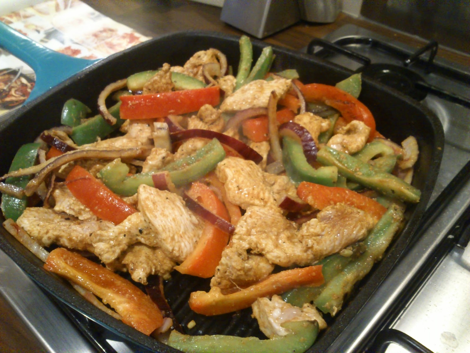 2 chicken breasts, green pepper, red pepper and an onion with paprika and cumin, cooked on the griddle pan.