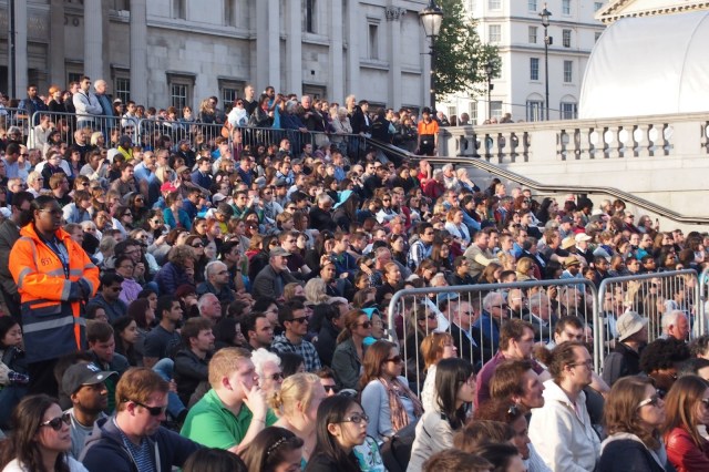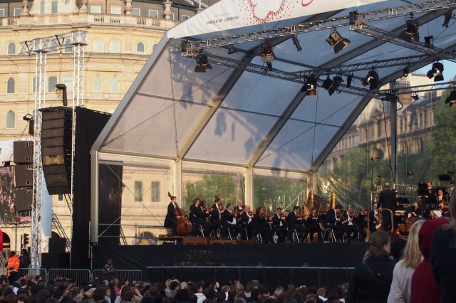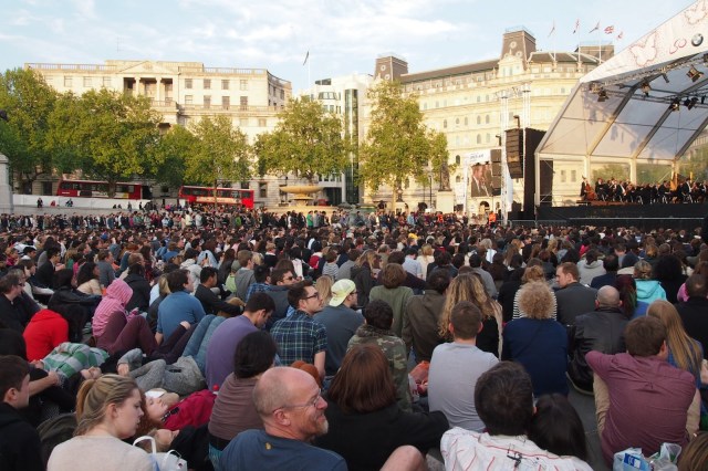 On Monday evening I found myself sitting cross-legged on the stone slabs of Trafalgar Square with several hundred other people, listening to classical music reverberating through the warm summer air.
