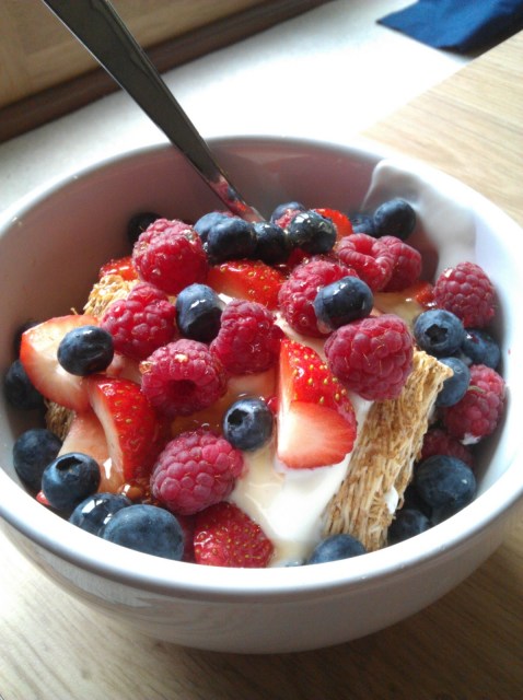 BreakfastTwo shredded wheat with Greek yoghurt, raspberries, strawberries and blueberries and a drizzle of agave – so summery and yummy!