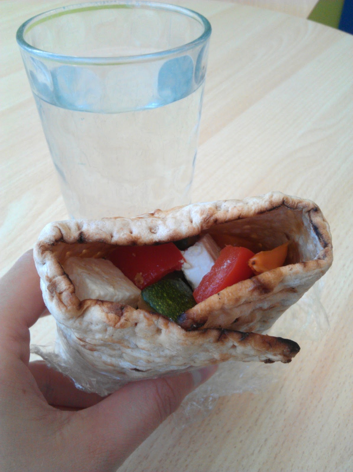 Lunch Warburtons wholemeal square (I admit, I was sucked in by the novelty!) wrap with stir-fried veggies (courgette, red and orange peppers) and feta.