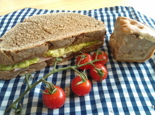 LunchSandwich on rye bread with ham, Saint Agur blue cheese spread and lettuce. Chunk of pork pie from a picnic and some cherry tomatoes on the side.