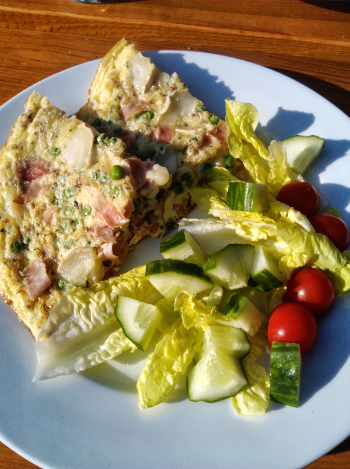 DinnerA summery frittata with goats cheese, ham, and peas, with salad. We ate outside sitting on the bench in the garden although a persistent wasp kept trying to eat my food!