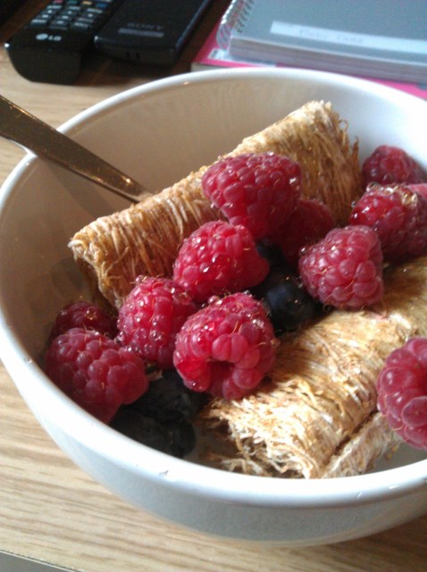 Breakfast2 shredded wheat with frozen cherries (defrosted in the microwave), milk and agave nectar (forgot to take a picture, hence why the photo shows different fruit!)