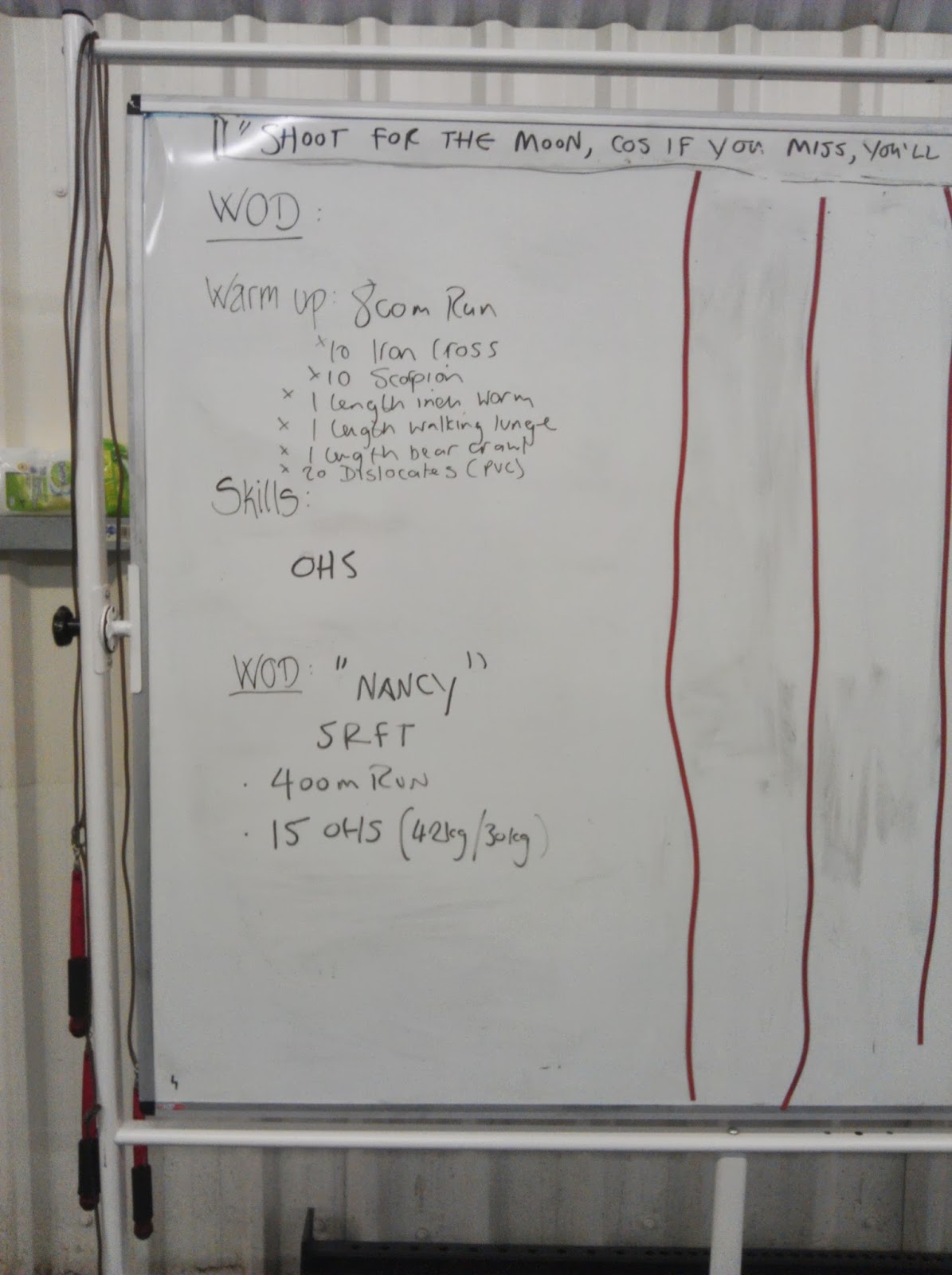 I only used 15kg for the squats (Rx weight for women 30kg, ouch!) and finished in about 18minutes (forgot to write my time on the board, as so did everyone else apparently- perhaps we were too exhausted!)