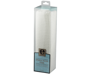 The Sports and Travel Towel from E-Cloth is made from specialised fibres which are 4 times more absorbent than cotton, and is therefore much thinner than ordinary towels. It can be rolled up very small, so is ideal for sports or travelling.