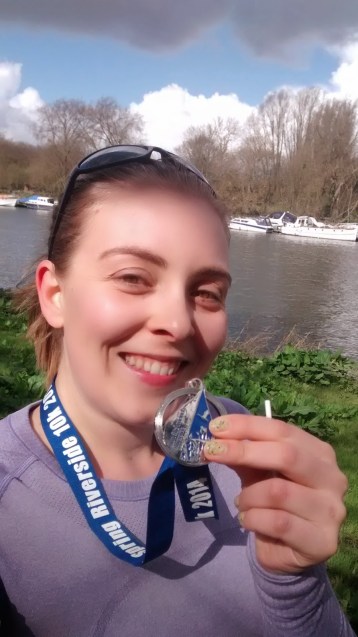 The following weekend I completed 8 miles including the Richmond Spring Riverside 10k. I ran from Richmond station to the start line, just under 2 miles, then queued for 20mins for the toilets (10portaloos for over 1000 runners was not enough!) while doing some stretches in the line. I then joined the back of the crowd of runners, at the start. We were set off in waves due to the narrowness of the course and with no particular pace/finish time discrimination, so there was a bit of overtaking and weaving for the first few 100m. This wasn’t really an issue for me though, I settled into my happy plod, plugged into my latest Jillian Michaels podcast πŸ™‚