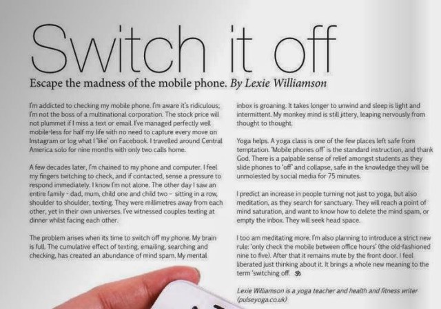 So maybe don’t make checking your phone the first thing you do when you wake up- have a cup of tea instead π Or take an hour out of your week to attend a yoga class, where you can switch off and escape to a place of sanctuary and relaxation for a while.