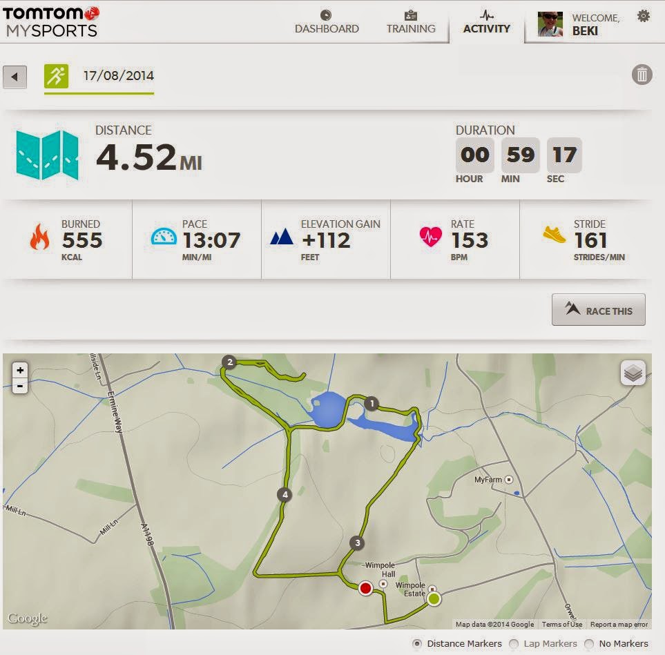 I love Wimpole Estate- they have a 10 mile and half marathon there in the Autumn too.I like my Garmin although it is a bit temperamental when finding a satellite at the moment which is a bit annoying. I want something as simple to use as possible, and waterproof (against rain anyway).