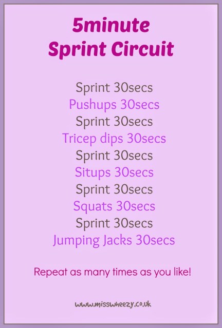 One week we followed up our Upper Body workout with this short Sprint Circuit- you can also modify it to 15/20 reps if you don’t have a timer, and just pick two points (eg. tree and lamp-post) to run between. This was a particularly hard one as it really keeps your heart rate high throughout!