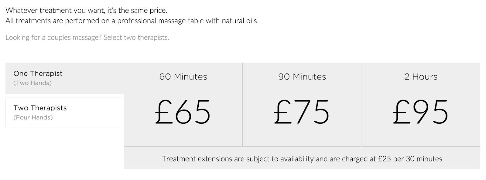 Urban Massage offer a variety of different treatments, and once you’ve entered your postcode (currently only London and Bristol), you are able to select a therapist- so you can choose male or female- and the length of your massage.