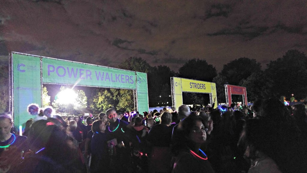 I lined up on the start line of the Shine Night Walk Half Marathon with the rest of #TeamSOLE, and thousands of other enthusiastic walkers raising money for Cancer Research UK, under a darkening sky. We opted to join the “Power Walkers”, those aiming to complete the 13.1 miles in under 4.5hours, something that seemed pretty achievable. The race village in Southwark Park had toilets and a bag drop although if you read my “Race Prep” blog post, you will have seen I opted to carry my Camelbak with me.