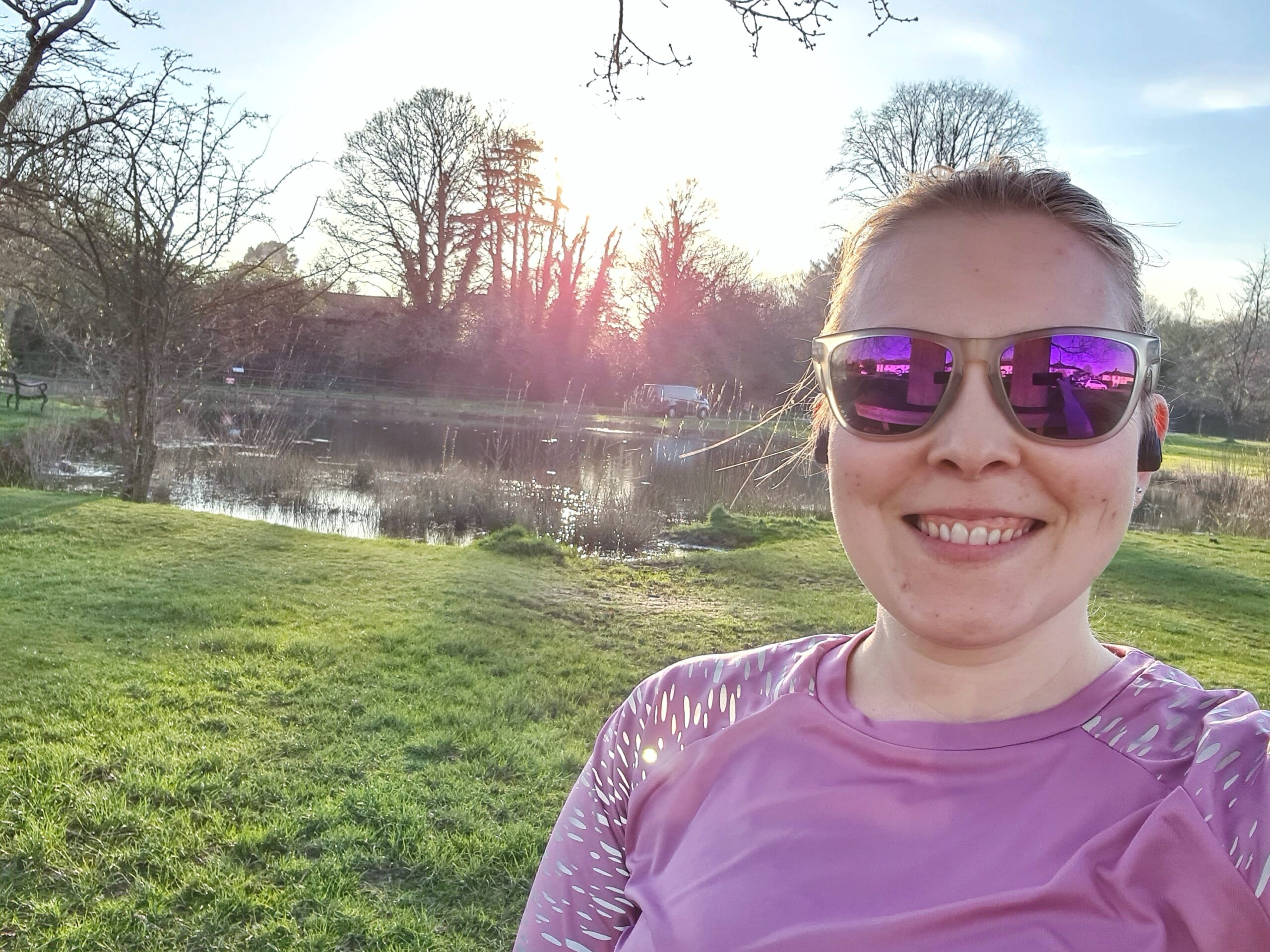 Running selfie in front of pond
